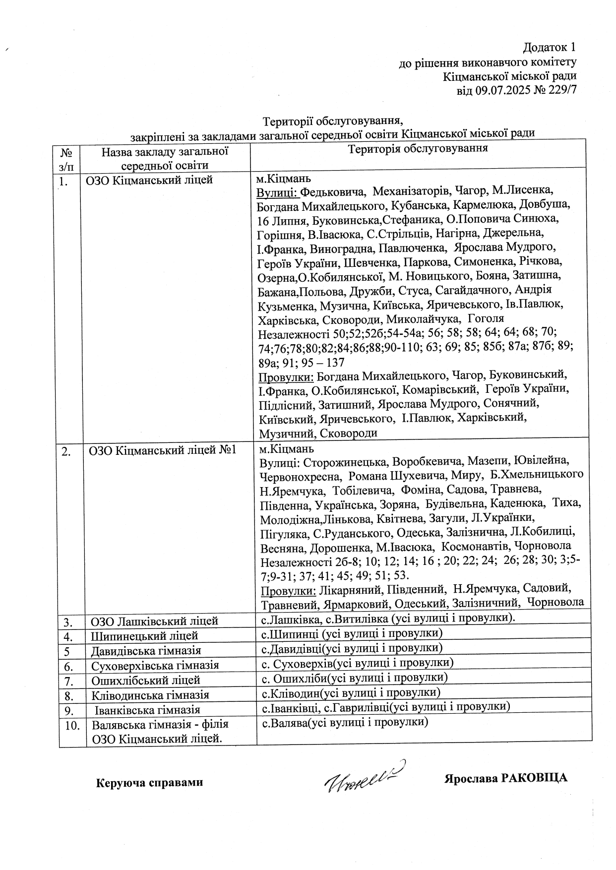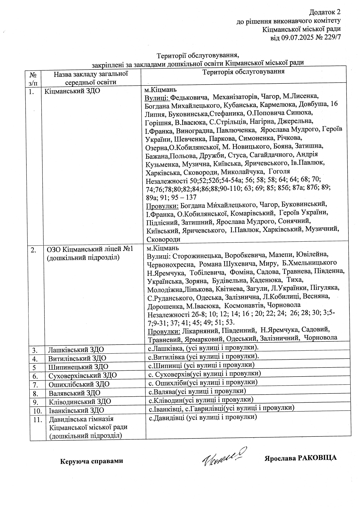 Про закріплення території обслуговування за закладами дошкільної освіти Кіцманської міської ради